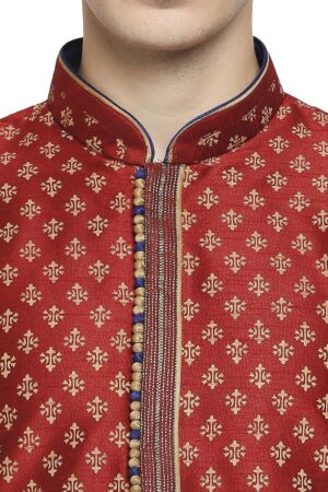 Be the first to review “Red Block Printed Silk Kurta With Contrast Blue Silk Embroidered Into The Gold Zari Collar And Neckline And Contrasting Knot Button Detailing To Conceal Fasteners”