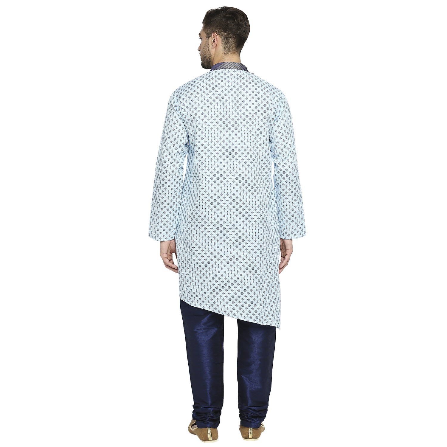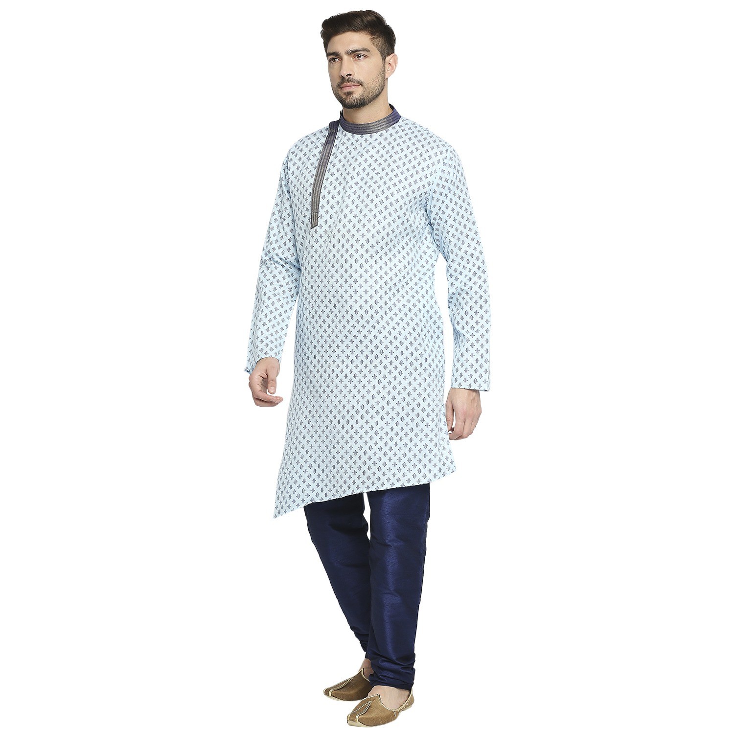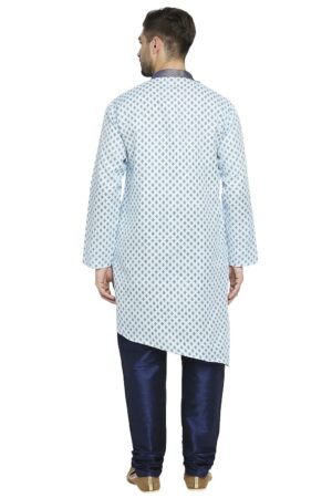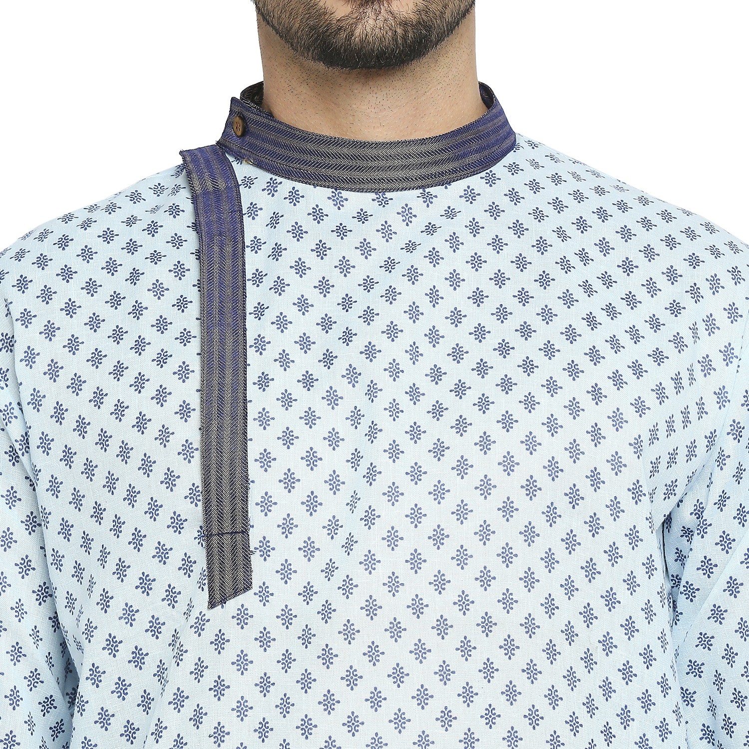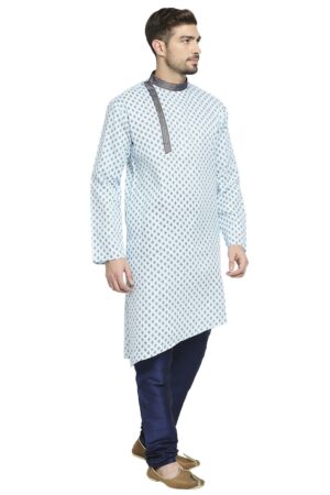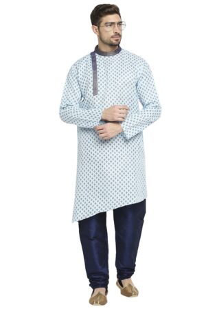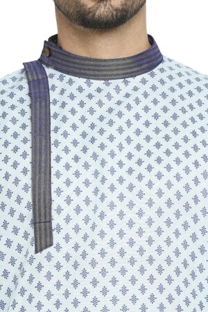Be the first to review “Sky Blue Cotton Blend Kurta With A Contrast Print And Angarkha Styling, Embellished With Navy Blue Brocade Collar And Placket.”