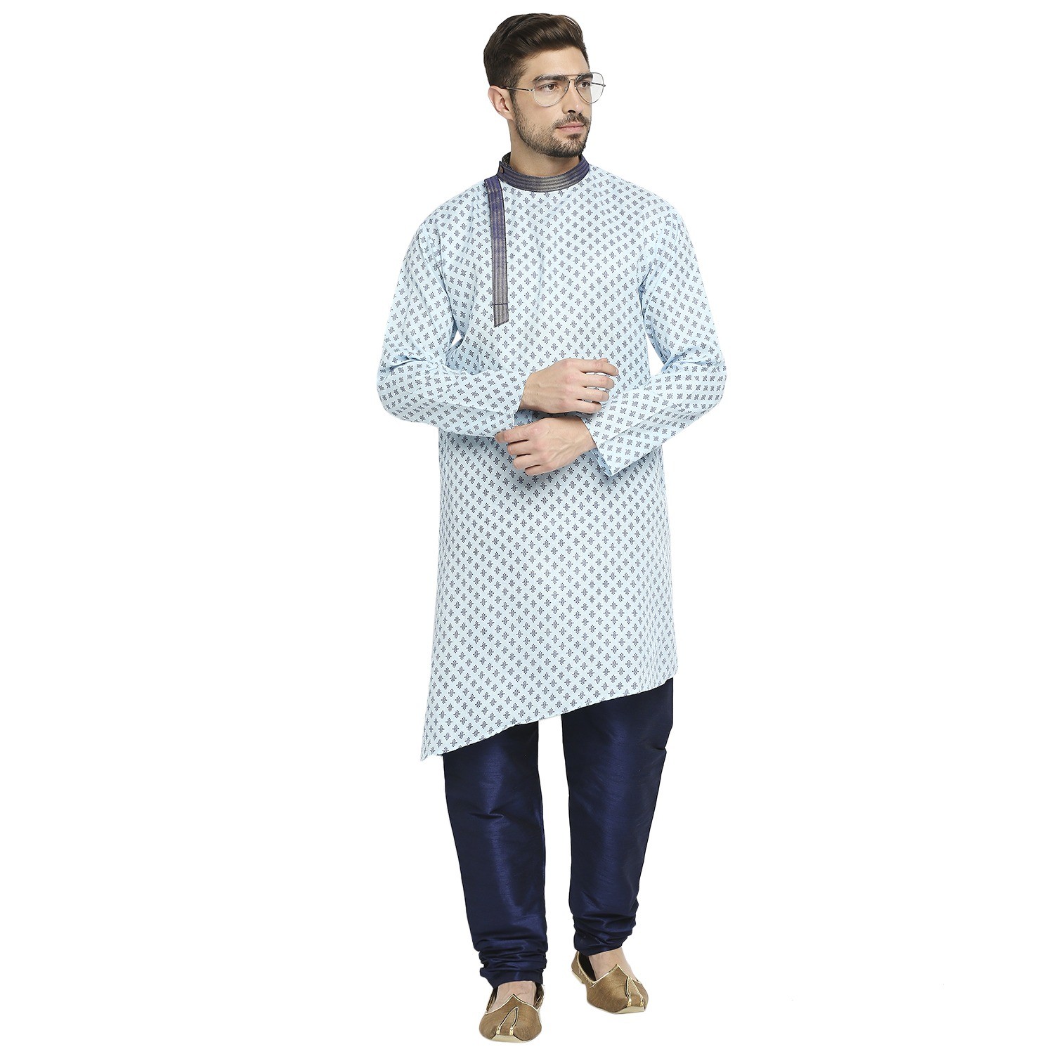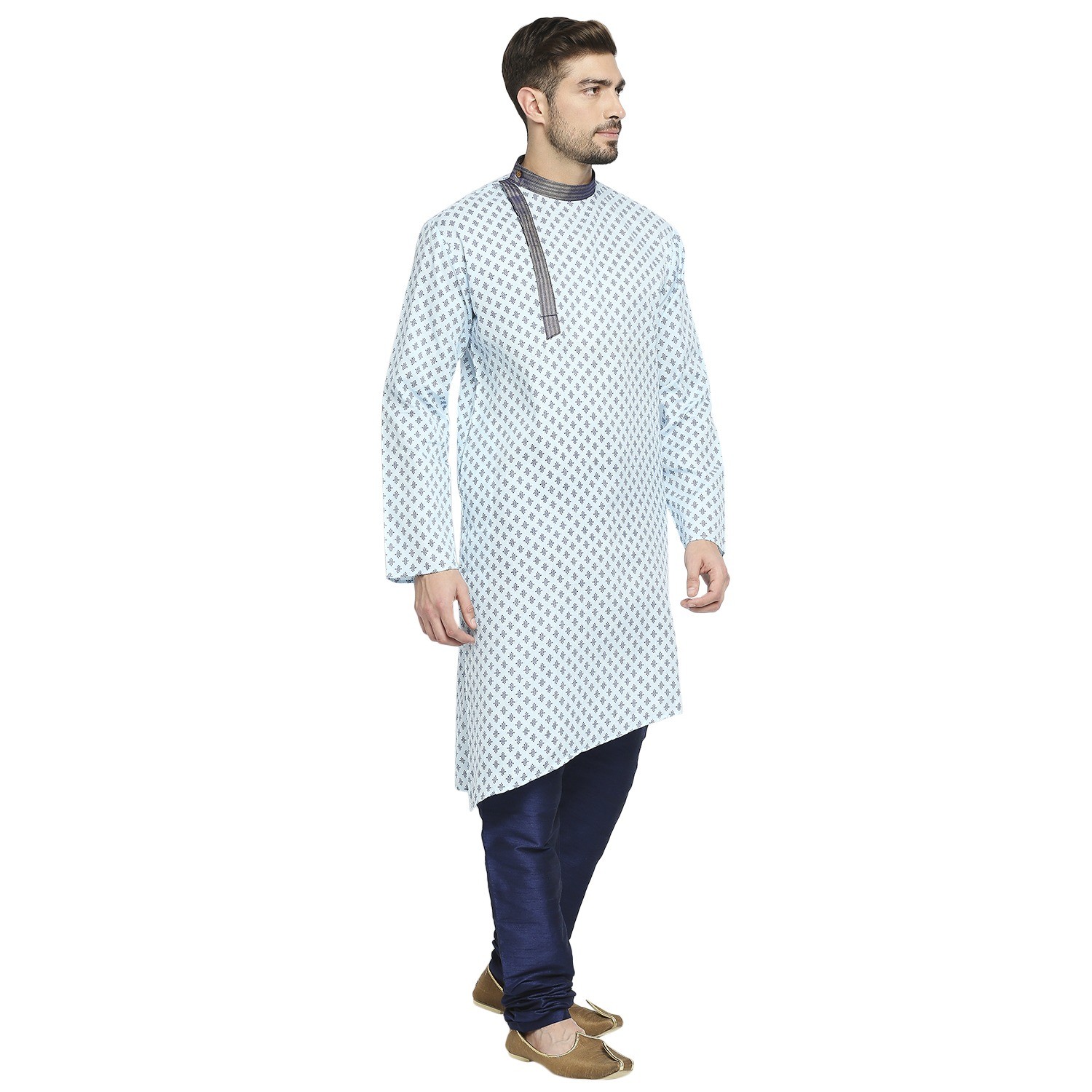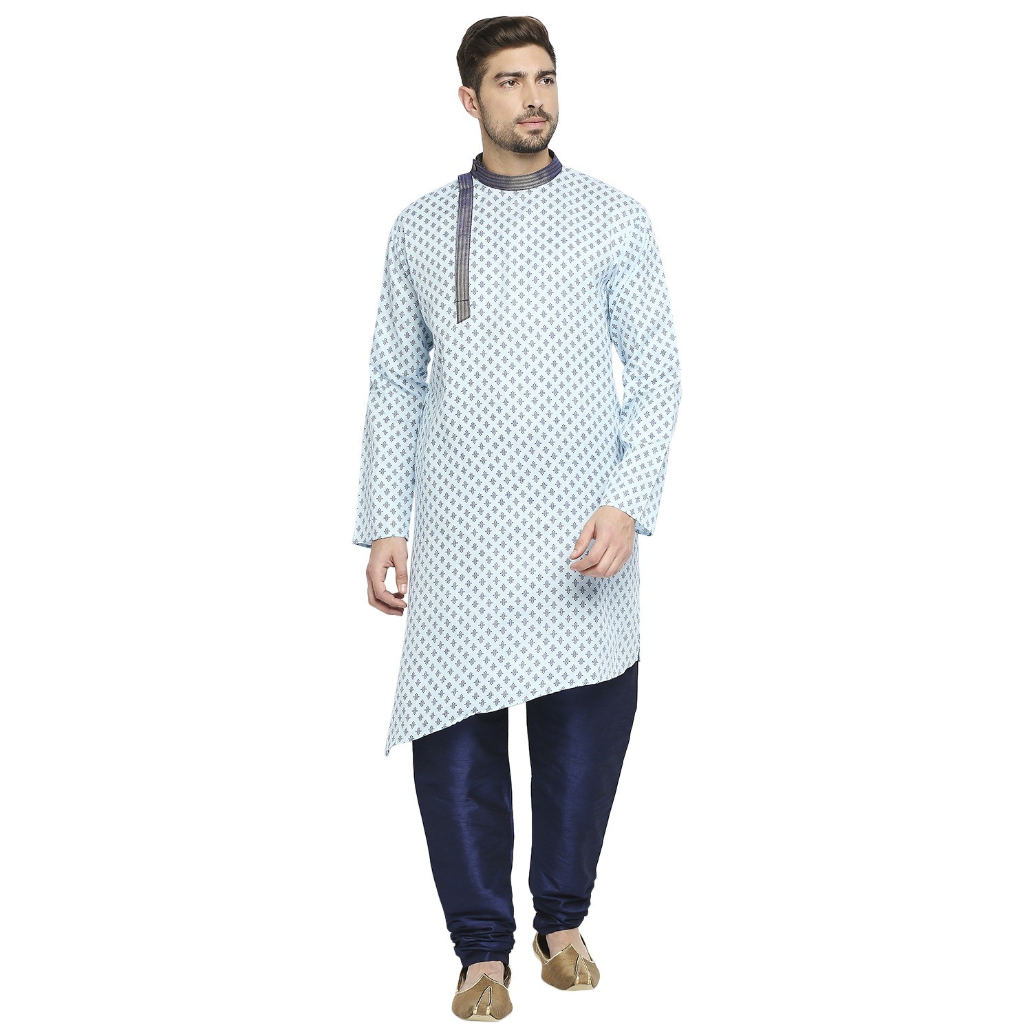 Be the first to review “Sky Blue Cotton Blend Kurta With A Contrast Print And Angarkha Styling, Embellished With Navy Blue Brocade Collar And Placket.”